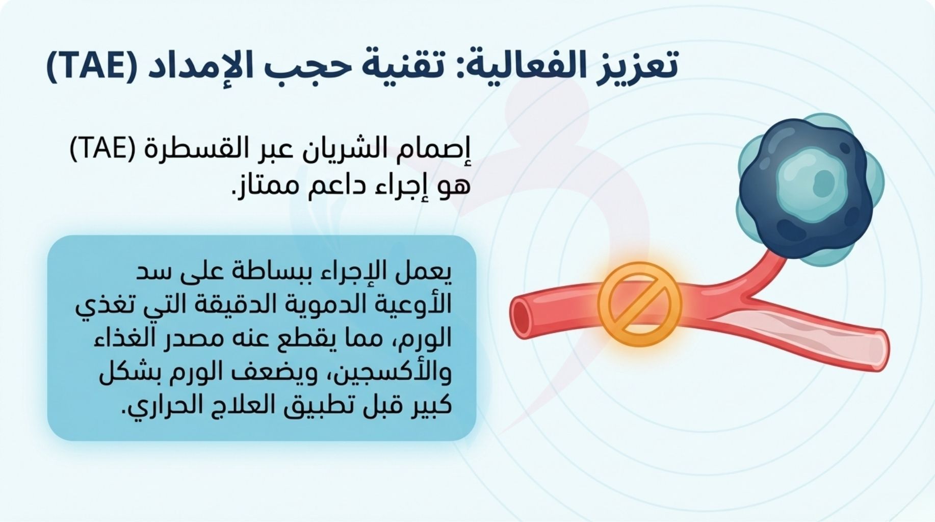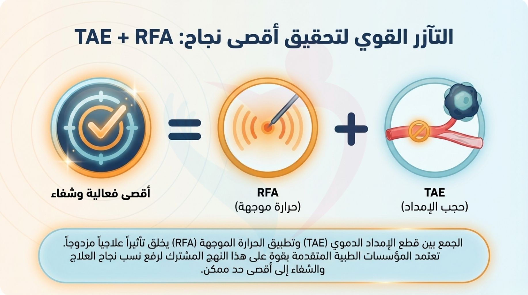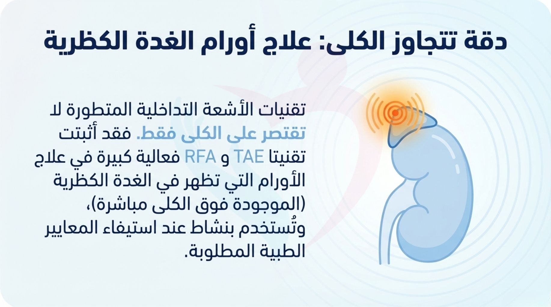 * علاج أورام الغدة الكظرية: لا تقتصر فعالية هذه التقنيات على الكلى فقط؛ بل نستخدم TAE و RFA بنجاح كبير لعلاج الأورام التي تصيب الغدة الكظرية (الموجودة فوق الكلية).
