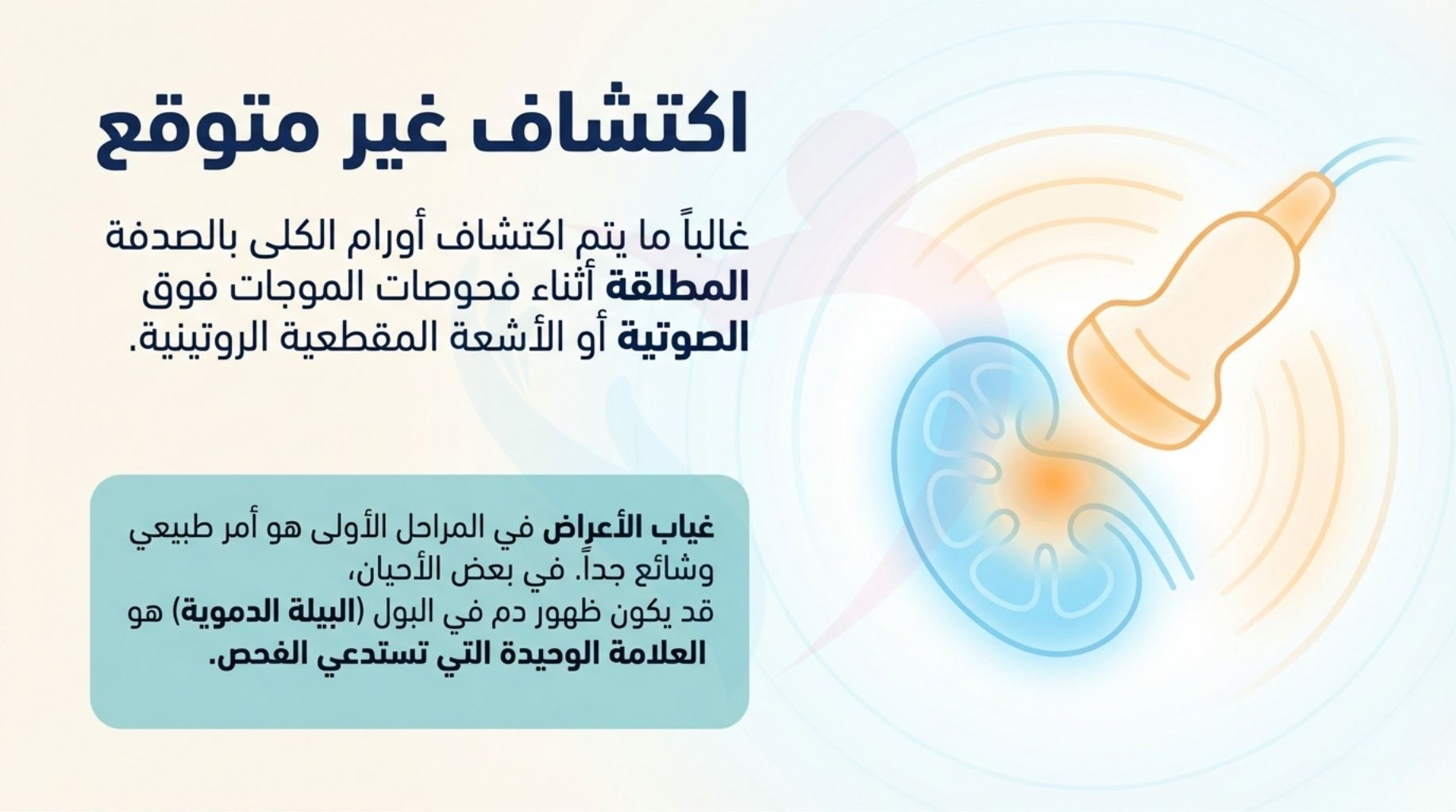 بصفتنا متخصصين في الأشعة التداخلية والتثقيف الصحي، نلاحظ أن سرطان الكلى غالباً ما يتم اكتشافه "بالصدفة البحتة" أثناء خضوع المرضى لفحوصات روتينية أو فحوصات لأعراض غير صلة باستخدام الموجات فوق الصوتية أو الأشعة المقطعية (CT). ومن واقع خبرتنا الإكلينيكية، نود توضيح النقاط الأساسية التالية حول ما قد تظهره الفحوصات: