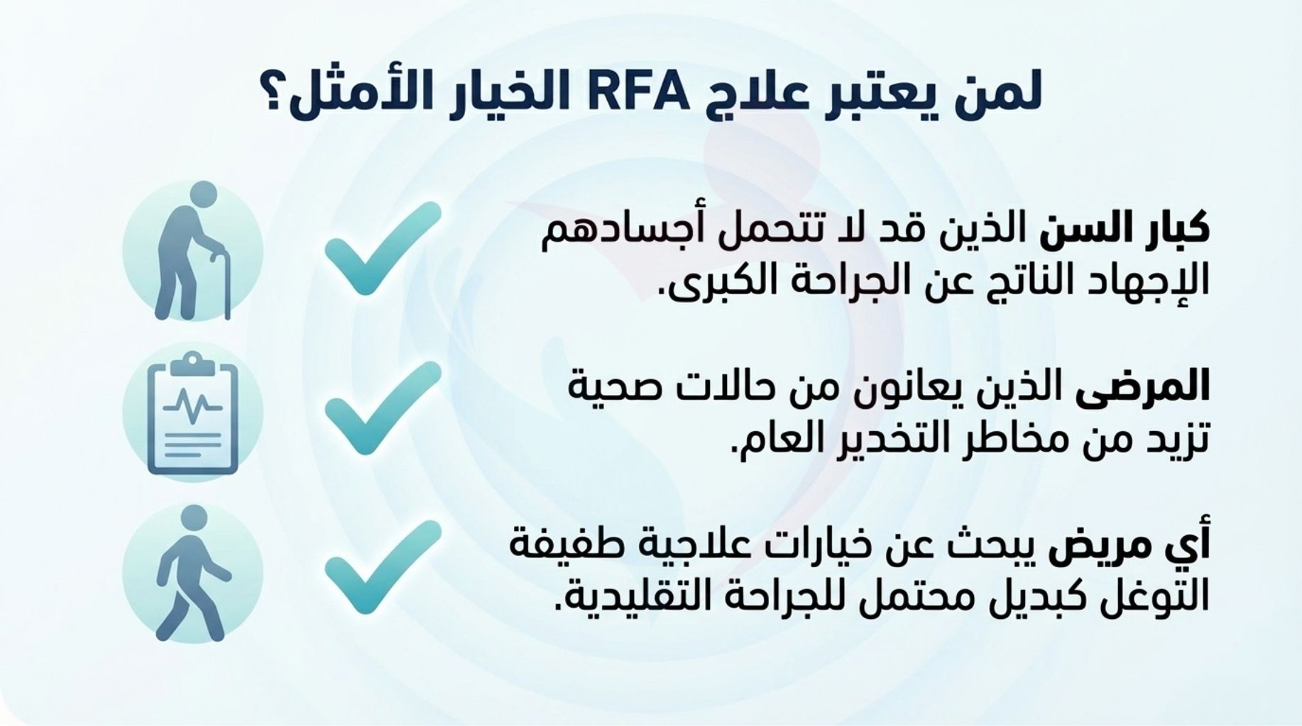 * بديل مثالي لكبار السن الذين يواجهون مخاطر عالية من التخدير العام، حيث يوفر لهم خياراً علاجياً فعالاً بأقل قدر من الإجهاد البدني.