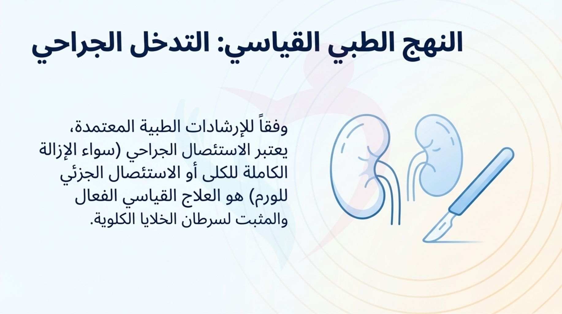 * الجراحة للحالات المتقدمة: حتى في حالات الأورام الكبيرة أو وجود نقائل سرطانية (انتشار)، لا يزال خيار استئصال الكلية الكلي أو الجزئي قائماً كخيار علاجي رئيسي.