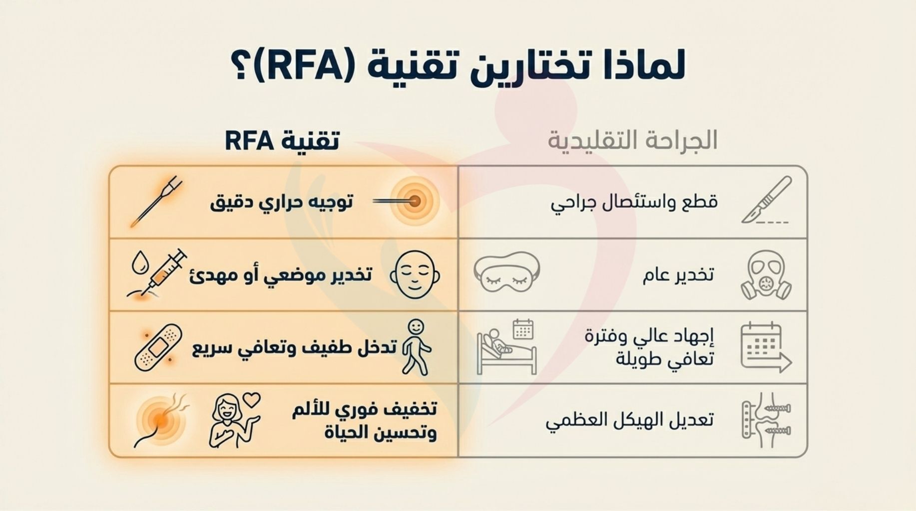 الكي الحراري RFA (الاستئصال بالترددات الراديوية) تخفيف فوري للألم وتقليل الاعتماد على المخدر يعتمد النجاح على البعد عن الأعصاب الحيوية
