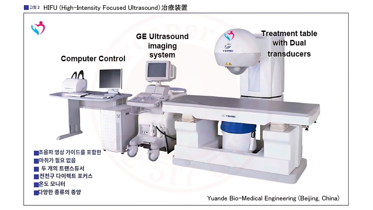 사진이 HIFU의 치료 시스템과 실제 치료 풍경입니다(그림2, 사진3).