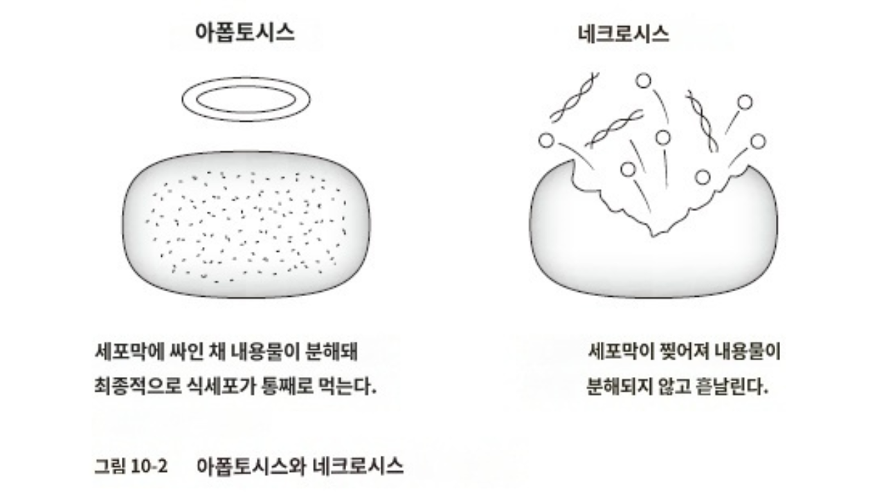 몸속에서 세포가 죽는 패턴으로 크게 두 가지 양식이 있습니다. 아폽토시스와 네크로시스입니다(그림10-2). 아폽토시스가 유도되면 세포막에 싸인 채 내용물이 분해되고 마지막에는 식세포가 통째로 먹고 처리하는 것. 한편 네크로시스에서는 세포막이 찢어져 내용물이 분해되지 않고 흩날립니다. 외상이나 화상, 약물, 방사선 등이 유인이 되는 것입니다.