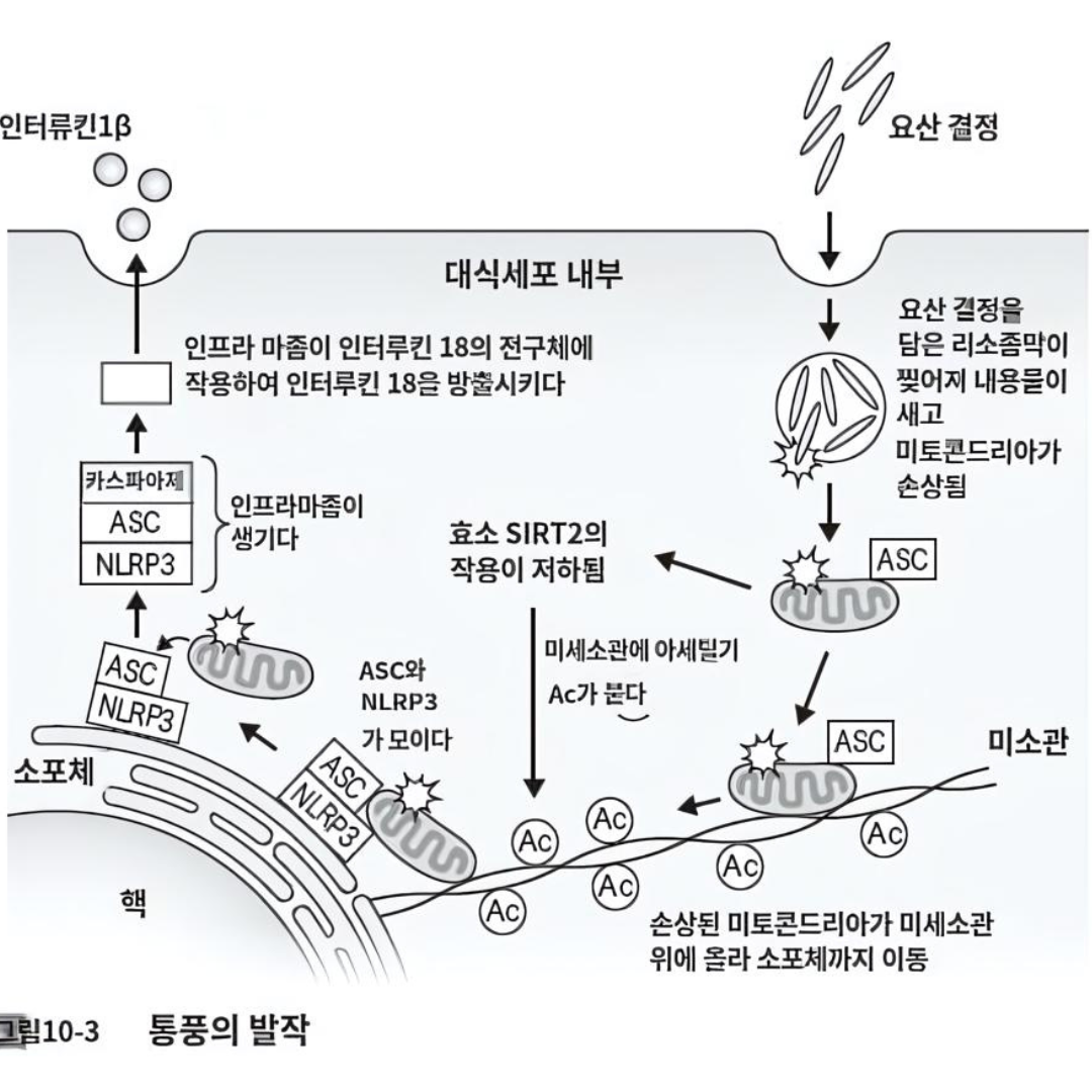 식세포가 요산 결정을 세포 내에 흡수하면 요산 결정의 자극으로 미토콘드리아가 손상됩니다. 그러면 SIRT2라는 효소의 작용이 저하되고 세포 내 수송로인 미세소관에 아세틸기라는 분자가 붙습니다. 그 결과 손상된 미토콘드리아가 미세소관 위에 올라타 세포 중심부 소포체까지 이동합니다. 이렇게 소포체의 NLRP3와 미토콘드리아가 가진 부품 ASC가 갖추어져 있으며, 또한 카스파아제라는 부품도 물어 복합체가 조립됩니다. 이 복합체를 인프라마좀이라고 합니다.