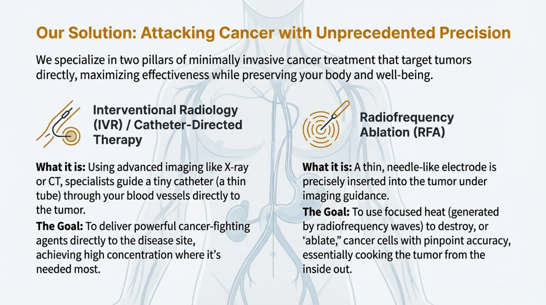 The "Cutting-Less" approach represents the pinnacle of patient-centered oncology. By utilizing high-precision Interventional Radiology, we target the cancer with devastating accuracy while protecting the essence of who you are.