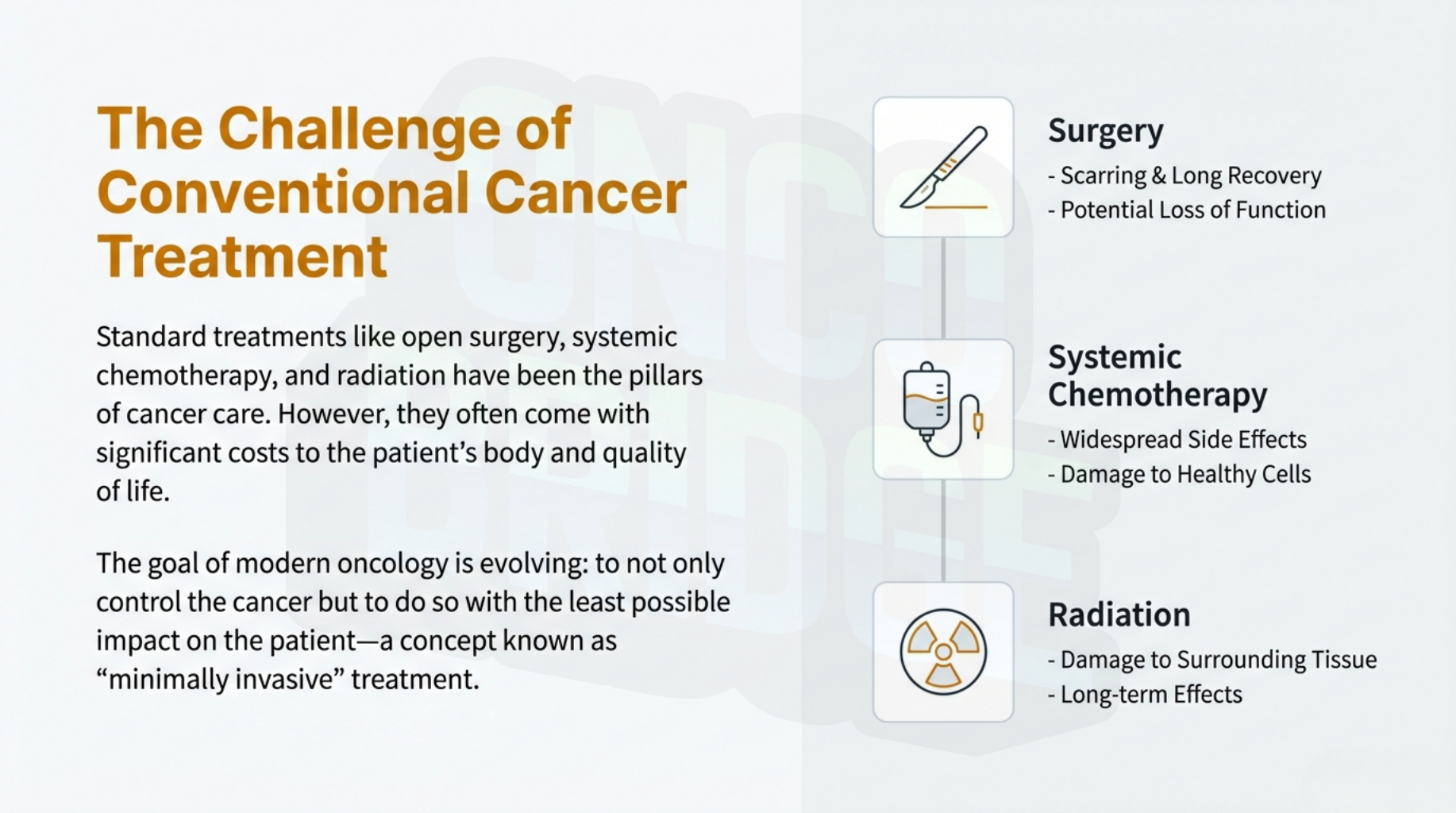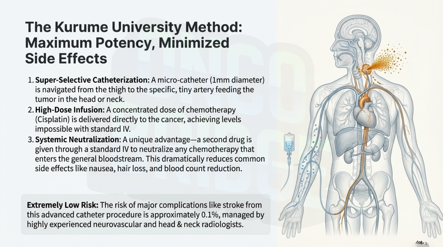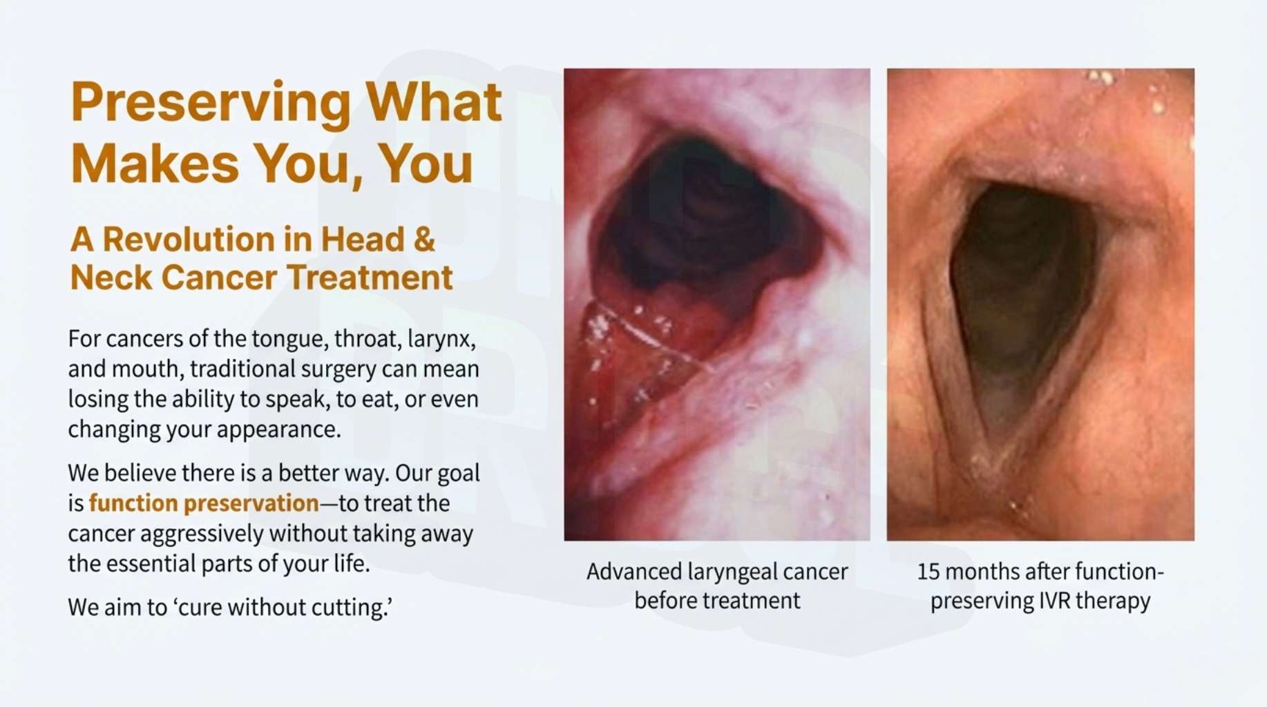 This approach utilizes advanced imaging and minimally invasive techniques to treat cancer while protecting the body’s essential functions—like speaking, swallowing, and natural movement. For the international patient, "Cutting-Less" care means pursuing a non-surgical cure that prioritizes your quality of life, avoids major scarring, and maintains your daily independence.