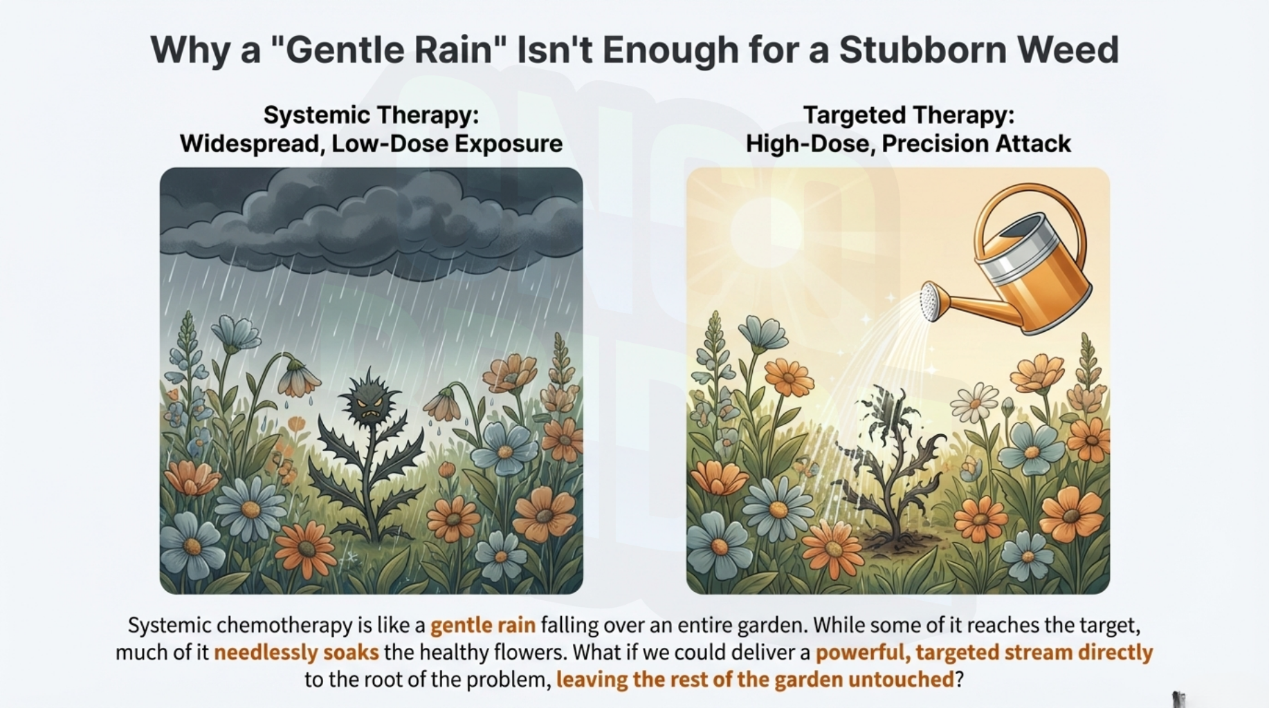 As a consultant, I often use a simple analogy to explain the power of this method: Standard systemic chemotherapy is like a leaky drip from a ceiling that eventually dampens everything in the room. Dong-ju therapy, by contrast, is like a powerful hose aimed directly at a single spot.
