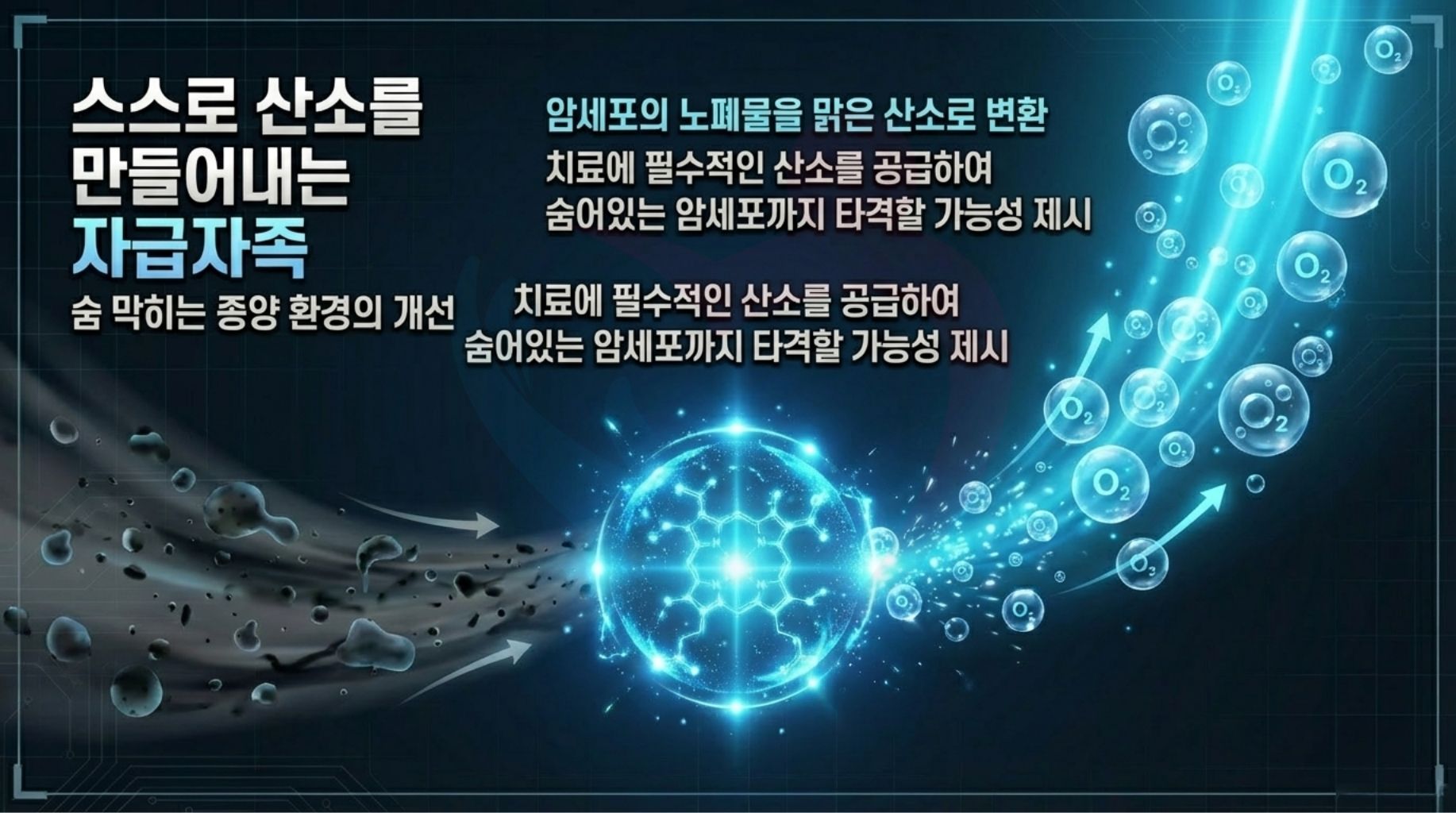 이 과정으로 광면역 암치료에 필요한 산소가 보충되어 치료 효율이 크게 높아지고, 산소 부족으로 치료에 잘 반응하지 않는 휴면 암세포도 다시 공격 대상으로 끌어올 수 있다.