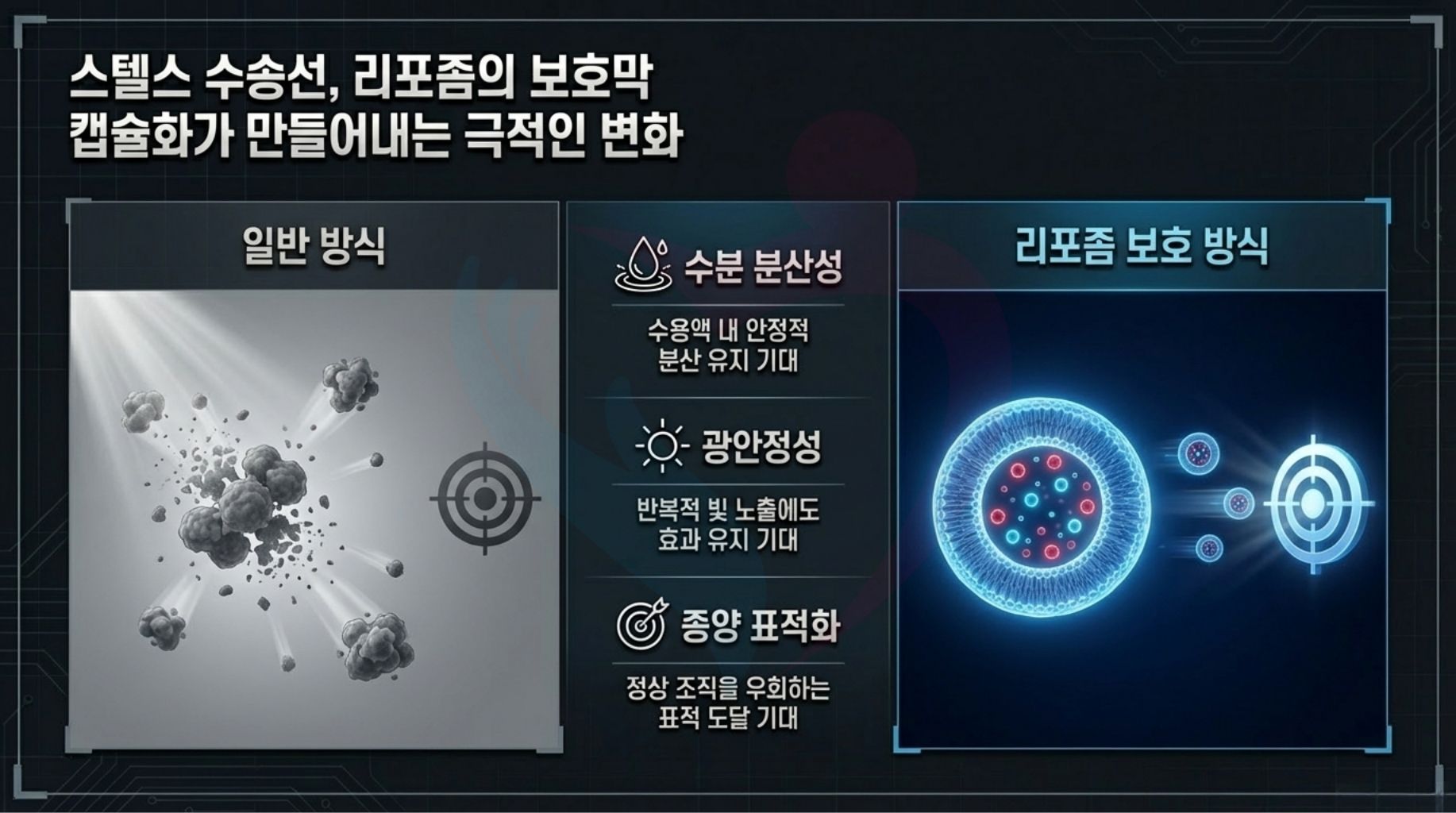 | 수분 분산성 | 소수성이 높아 침전되기 쉬움 | 지질막에 의해 수용액 내에서 안정 | 정맥 내 투여 및 경구 투여 가능 |