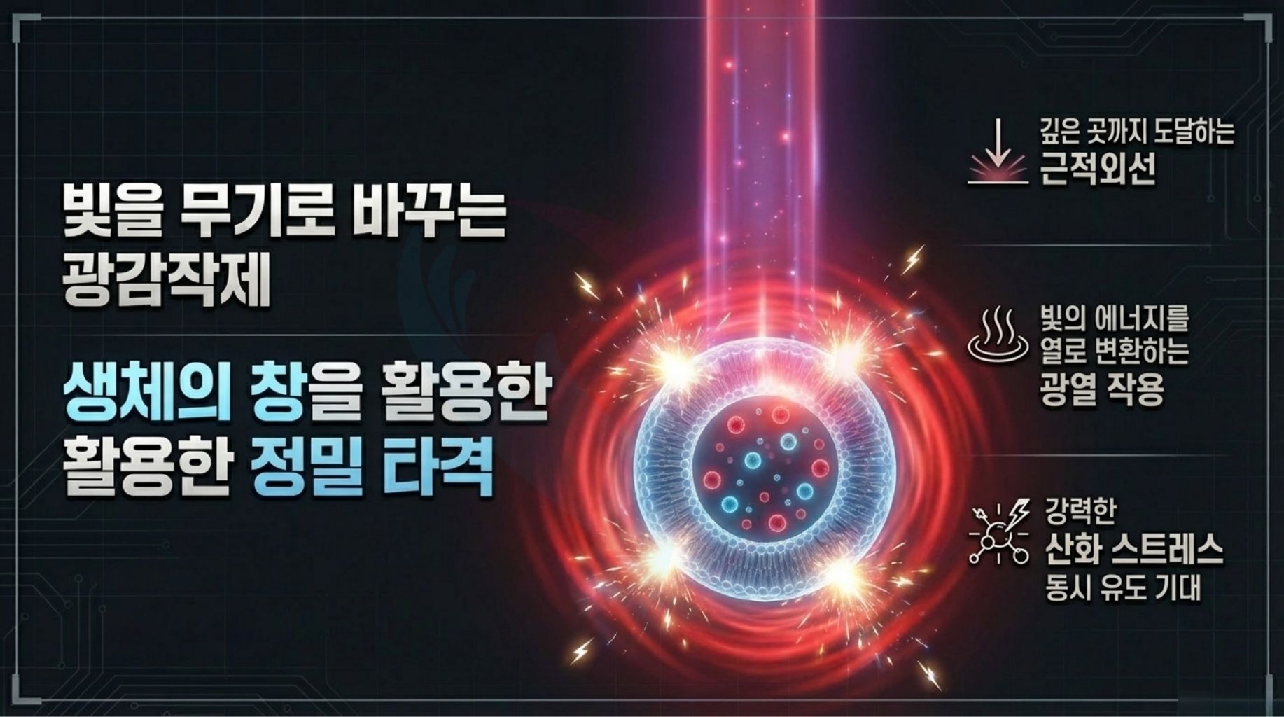 이 파장 영역은 생체조직 투과성이 높아 ‘생체의 창’으로 불리며, 신체 깊숙한 곳에 위치한 종양에도 비침습적으로 에너지를 전달할 수 있다.
